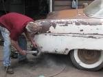 As you can see, the car has already been sprayed with high build primer roughly 15 – 20 years ago. So our first step was either having the car blasted or getting the DA’s out and getting to work. Since money is an issue, I choose to go with manual labor. We went to work with the DA sander’s and 80 grit paper the DA’s not meant to make the panel flat, but it will show high and low spots on the body and once we get this done we will know where we need to do our body work at. We will spray the entire car down with Rust-mort and hit the car again with the DA’s. We did find a few spots on the body we need to cut out and replace. We have allot of sanding still to do, but once all of that is done we will be ready to start playing with the filler! It was nice having my old man over and my buddy John helping me work on the car.