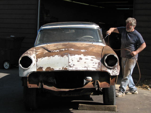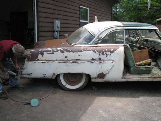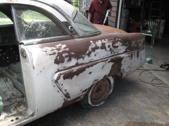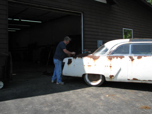 As you can see, the car has already been sprayed with high build primer roughly 15 – 20 years ago. So our first step was either having the car blasted or getting the DA’s out and getting to work. Since money is an issue, I choose to go with manual labor. We went to work with the DA sander’s and 80 grit paper the DA’s not meant to make the panel flat, but it will show high and low spots on the body and once we get this done we will know where we need to do our body work at. We will spray the entire car down with Rust-mort and hit the car again with the DA’s. We did find a few spots on the body we need to cut out and replace. We have allot of sanding still to do, but once all of that is done we will be ready to start playing with the filler! It was nice having my old man over and my buddy John helping me work on the car.