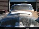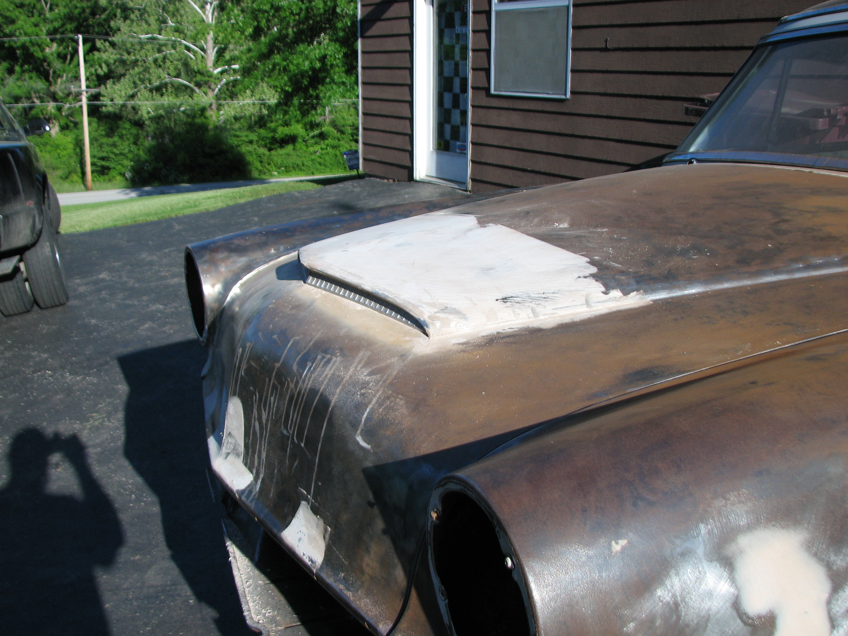 Putting in some serious hours trying to get this car done ASAP as there are some shows coming up I want to take this car to. These last few nights have been nothing but welding and filling in holes. Coming up with a look for the hood has taken some serious beer and hard thought decisions. I feel we have accomplished a pretty cool look when it’s said and done and is blended in it should rawk! I also went out and got all of the interior out of our other Merc for this one. It needs to be re-done but for now at least I have the frame work for it all. The other night I took out the rear side window and installed the new glass. That was a fun job if you have never done that consider yourself lucky! Here are some photos of the progress.