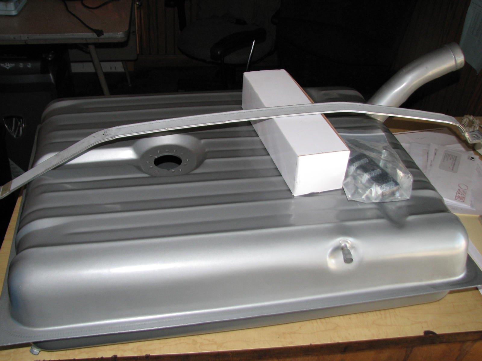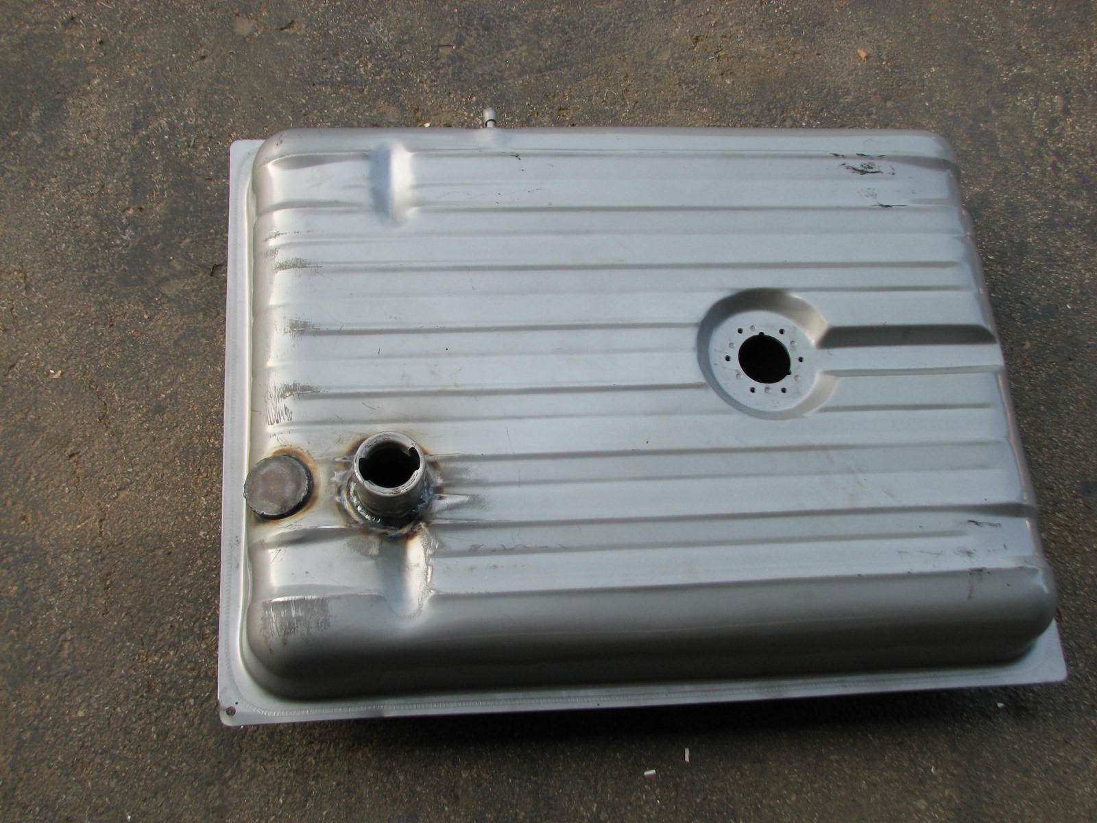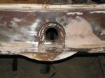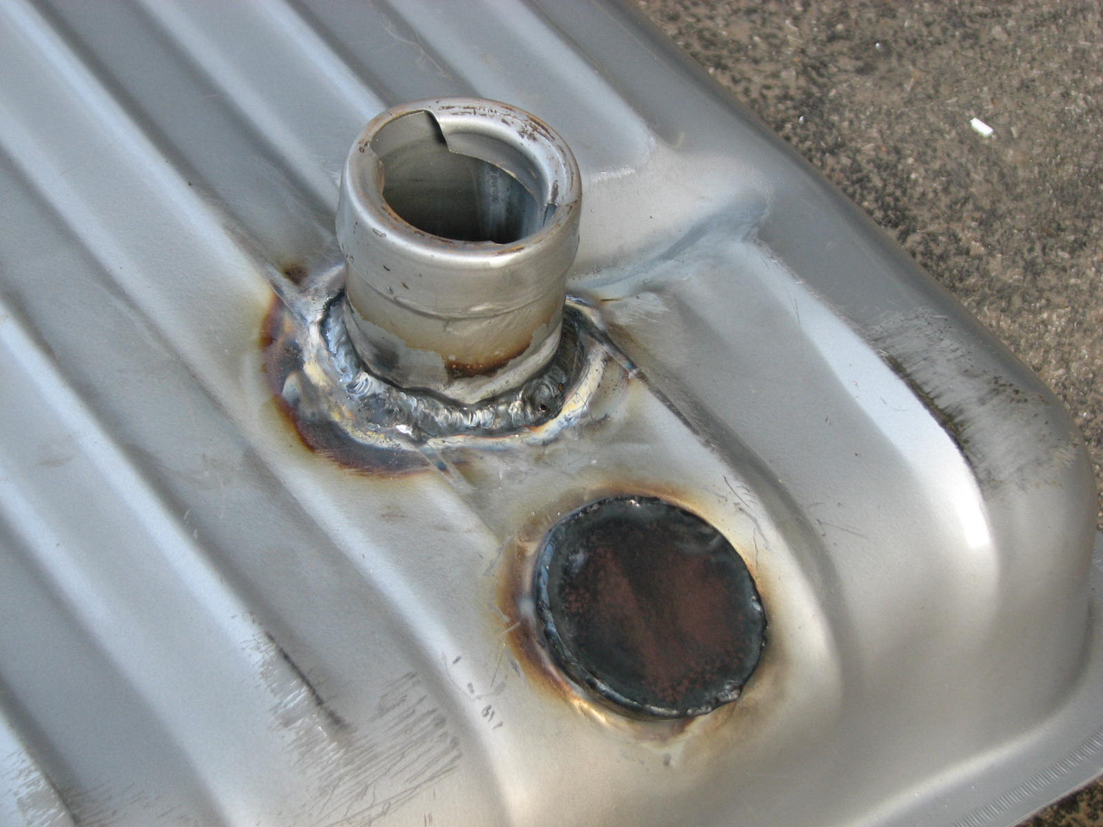 I found a new gas tank for the Merc………….. well, not really. This tank is for a 56 Ford, but the new 54 tanks were outrageous in price. It all works out in the end. The back of the car where the gas tank snout comes out has some rust, and we need to do some work to smooth things out. So we decided to take this beautiful new tank and cut the snout off. Then we welded it shut and relocated the filler neck. Now I can bring the channel up inside the trunk. This way, I can lay fresh metal across the back and eliminate the gas tank hole and license plate cover. We will now build a bracket off the bottom of the bumper, install a chrome license plate cover with a light, and install it there.