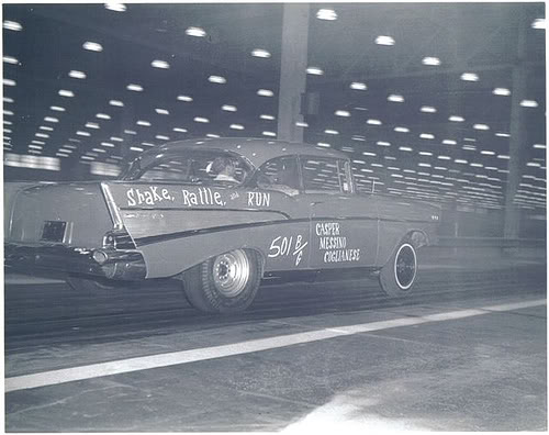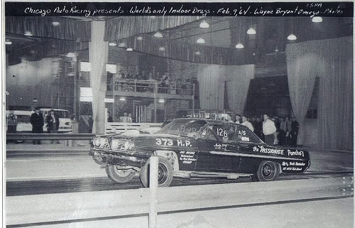 In 1962 those crazy guys from Chicago built the “Chicago Area Raceway” – INDOORS. It was located in the old International Amphitheater at 42nd and Halstead in Chicago Il. It was built in ’34 as a livestock showplace and in ’68 housed the Democratic Convention and at least one Beatles concert and one Elvis show. Advertised as the world’s only indoor drag strip, it was open about 2 years and featured a 440 ft. strip with a 660 ft. shut off and included a pit area.