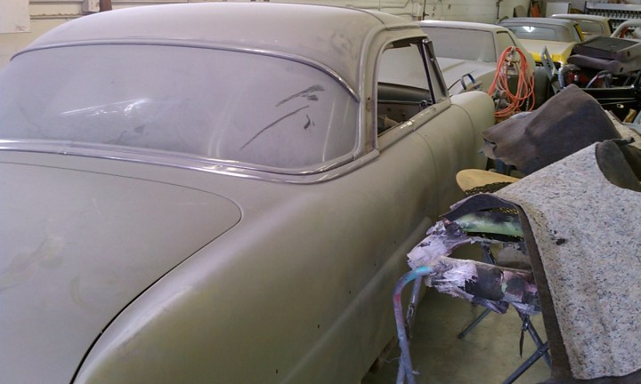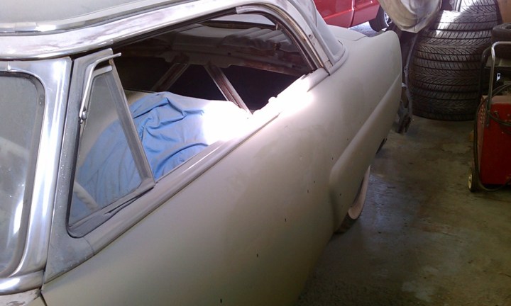 Meaning this project still needs to be completed. We are still in the bodywork stages, but here are some updated pictures of the Merc. Are we thinking about shooting it in white with a little pearl in it or small metal flakes and a bright fluorescent green metal flake roof? What do you guys think?